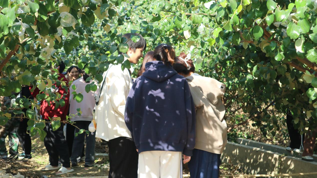 示范环节结束后,同学们来到标本园分组进行果树疏果和套袋实践,期间,同学们将所学理论知识付诸实践,并且相互交流心得,分享经验,形成良好的学习氛围。