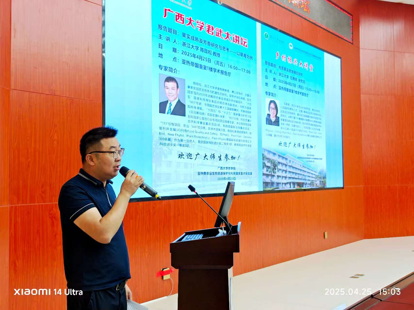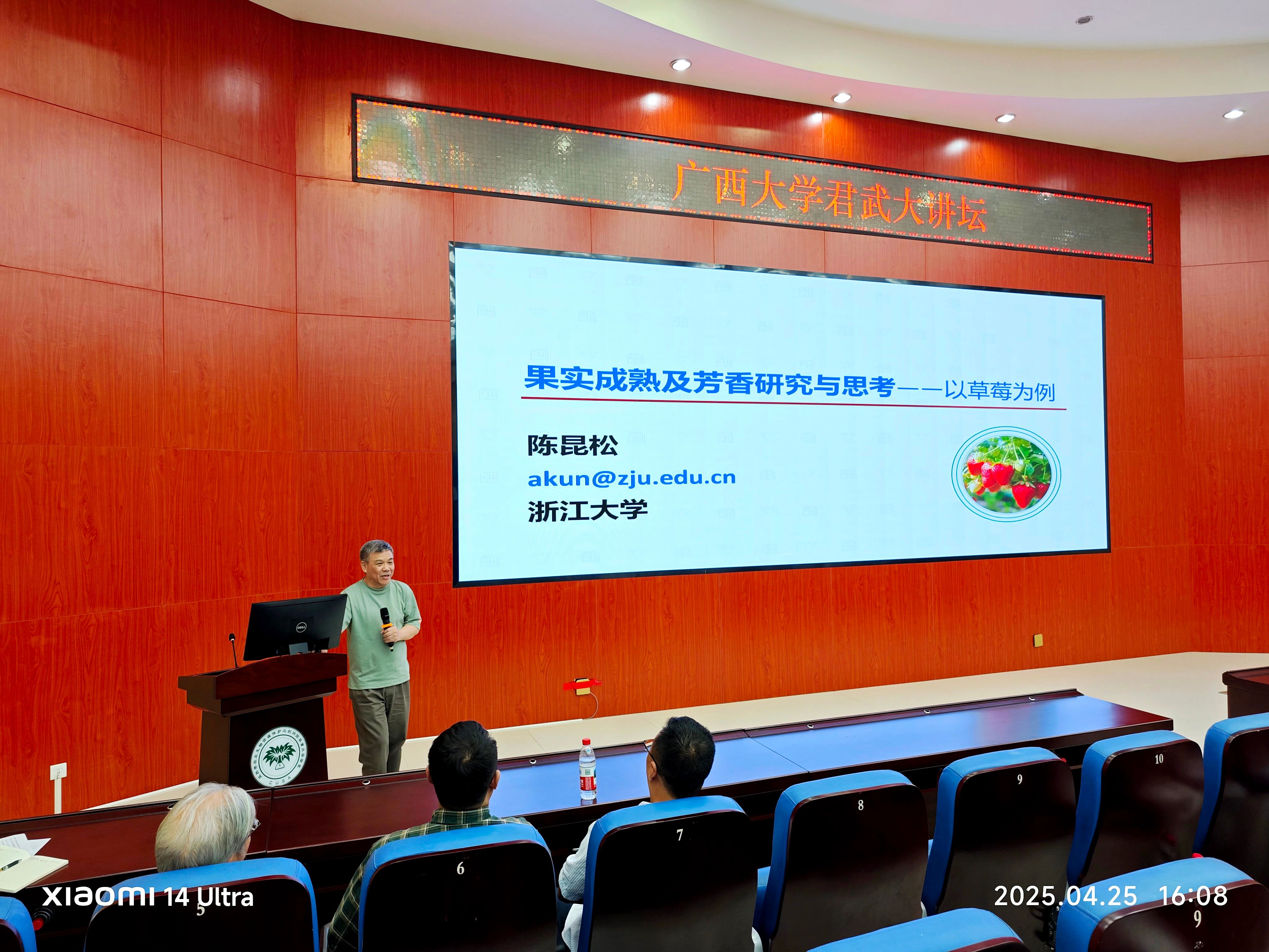 4月25日,浙江大学求是特聘教授陈昆松和浙江大学百人计划石艳娜研究员应邀到公司,开展了一场精彩纷呈的学术交流活动。陈昆松教授在君武大讲坛上,以“果实成熟及芳香研究与思考——以草莓为例”为主题进行了深度分享,石艳娜研究员则做客公司乡村振兴大讲堂,为师生作了题为“肉质果实质地调控研究”的学术报告。此次活动吸引了太阳集团122cc、亚热带农业生物资源保护与利用国家重点实验室(亚热带国重室)、生命科学与技术公司、轻工与食品工程公司等多个公司的200余名师生参与聆听,报告会由亚热带国重室主任兼太阳集团122cc经理张积森教授主持。