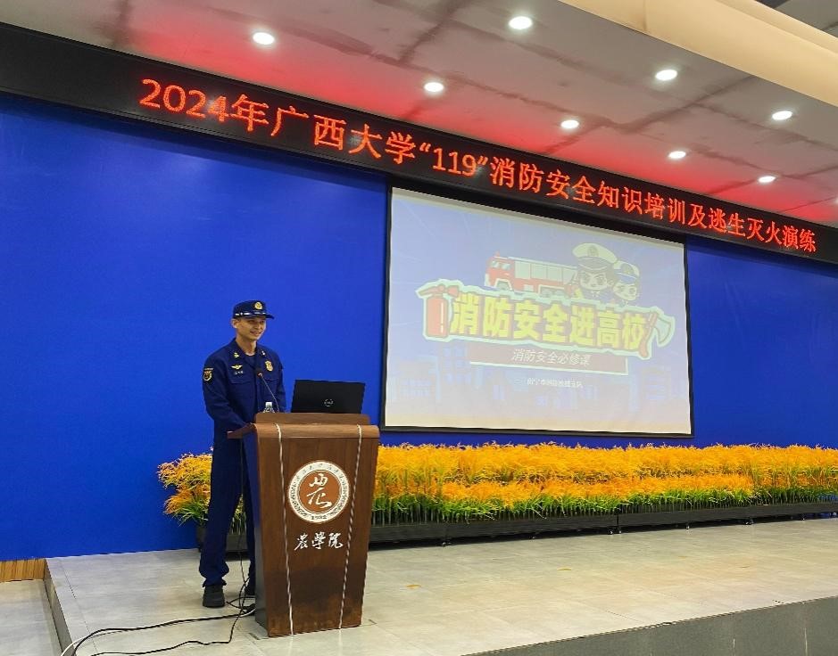消防安全知识培训中,西乡塘消防救援大队北湖中队黄荣成副站长围绕“消防安全基础知识”、“常见火灾类型及其预防”、“火灾逃生技巧”等内容进行了深入浅出的讲解。黄站长结合近年来国内高校典型的火灾案例,强调了预防为主、科学逃生及施救的重要性,使师生们对消防安全有了更为深刻的理解。
