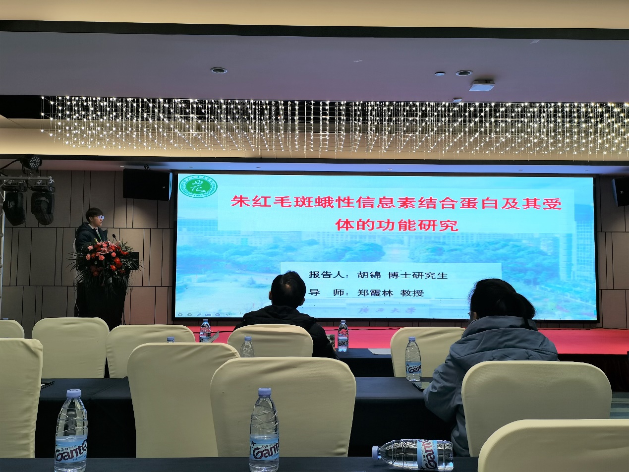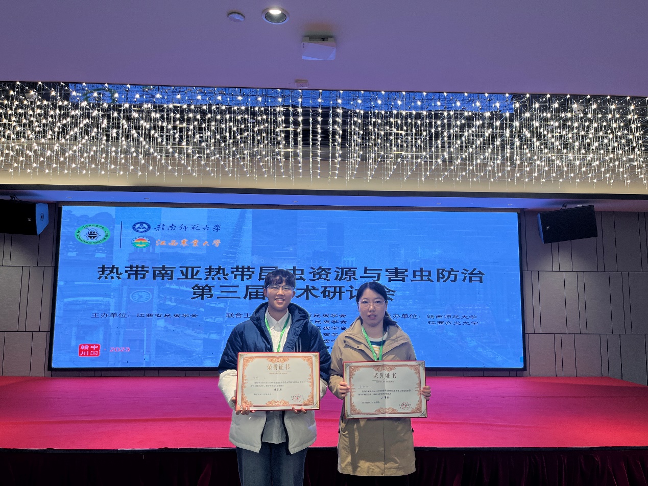 2023年12月3日-6日,热带南亚热带昆虫资源与害虫防治第三届学术研讨会在江西省赣州市召开,太阳集团122cc博士研究生胡锦和苏冉冉参加了会议,并分别做了学术报告。